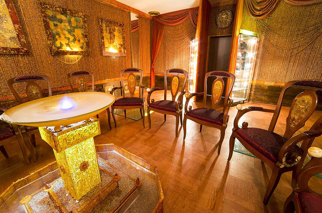 В янтарной комнате гости могут получить сеанс янтарной терапии. В центре комнаты расположена тумба из янтарных пластин, подсвеченная изнутри. Внутри огороженной конструкции насыпан необработанный янтарь. В верхней части расположена чаша, из которой выходят пары янтарной кислоты. Янтарь помогает снять головную боль, нормализовать давление, оздоровить сердце и сосуды.